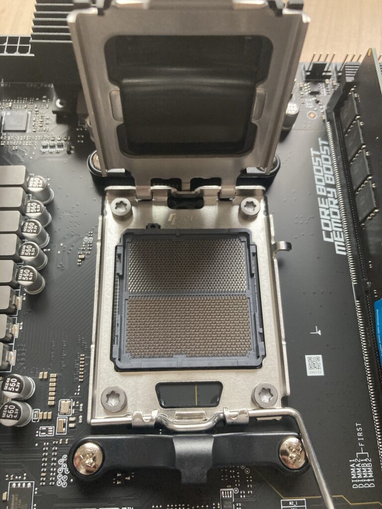 SSDを付けるネジはマザーボードに別の袋で付属されていました。マザーボード本体に最初付いていないので注意。(左側の固定するネジ)